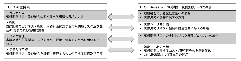 さらに、TCFDフレームワークは気候関連リスク・機会を財務的観点から開示することを推奨しており、FTSE Russellの「気候変動」テーマにおける評価観点と重なる部分が多く見られます。特に、ガバナンス、戦略、リスク管理、指標と目標といったTCFDの4つの柱は、FTSEの調査項目の構成にも影響を与えています。