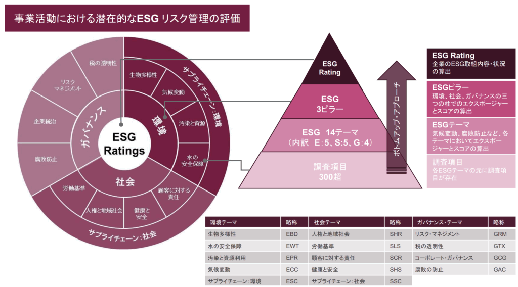 これらのテーマを通じて、FTSE RussellのESGレーティングモデルは、企業のESGリスクと対応状況を総合的に評価し、投資家やステークホルダーに信頼性の高い情報を提供しています。