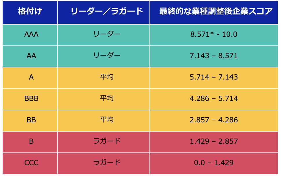 - 各Key Issueには業界別の重要度に応じた重み(ウェイト)が設定されており、それらを加重平均して環境/社会/ガバナンス(E/S/G)各ピラーのスコアを算出します。さらにそれらを統合し、0〜10の「産業調整後スコア」に変換。最終的にAAA〜CCCの格付けが付与されます。なお、ガバナンスピラーには最低33%の下限ウェイトが設定されており、全企業にとって一定の重要性を持つ設計となっています。