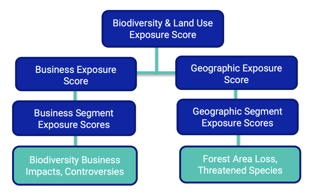 - ビジネス面の曝露(Business Exposure Score):事業セグメントの自然資源依存度や生物多様性への影響(例:森林伐採による訴訟頻度)を評価。