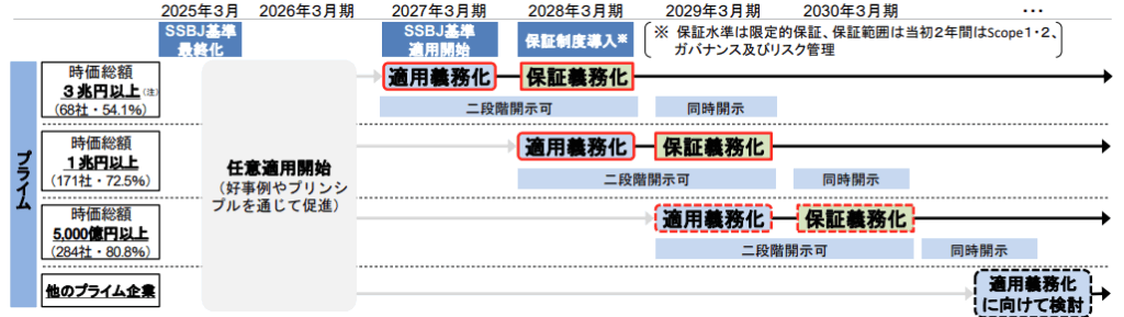 SSBJ基準の適用に関しては、企業の準備状況、投資家ニーズ、国際整合性などを踏まえた段階的な導入が進められます。初期段階では、プライム市場上場の中でも特に規模の大きい企業が対象となります。