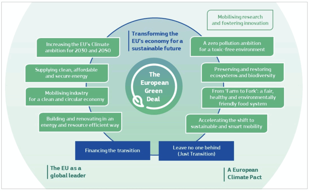 EUの最上位政策フレームワーク。気候中立・環境負荷低減・経済競争力を3本柱とする。
