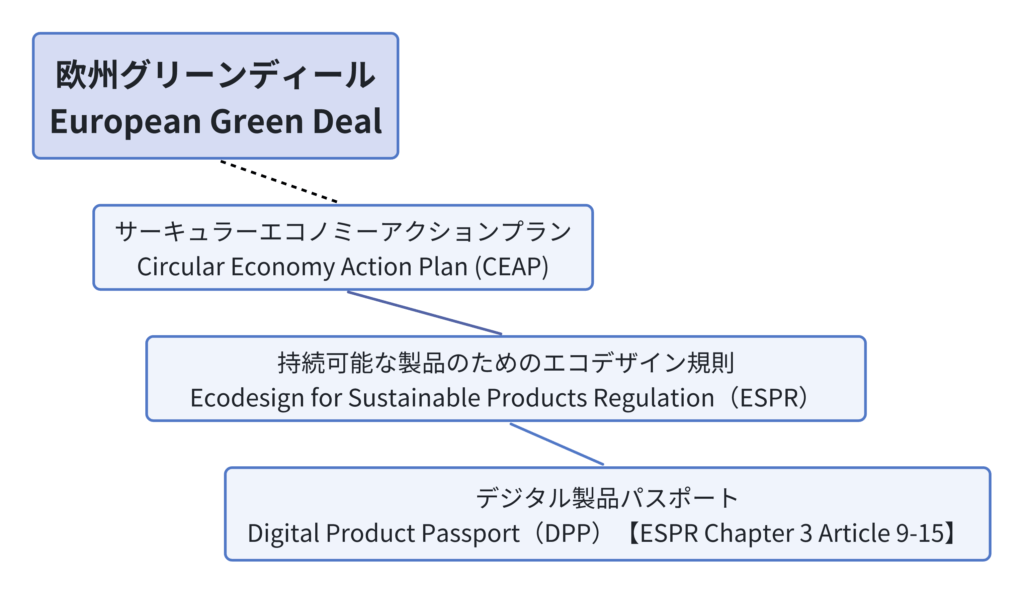 ESPRは、EUが掲げる「グリーントランジション(環境移行)」政策群の中でも、特に製品・資源循環に関する分野を担当する中核的な規則です。政策階層としては、以下のような構造で整理できます: