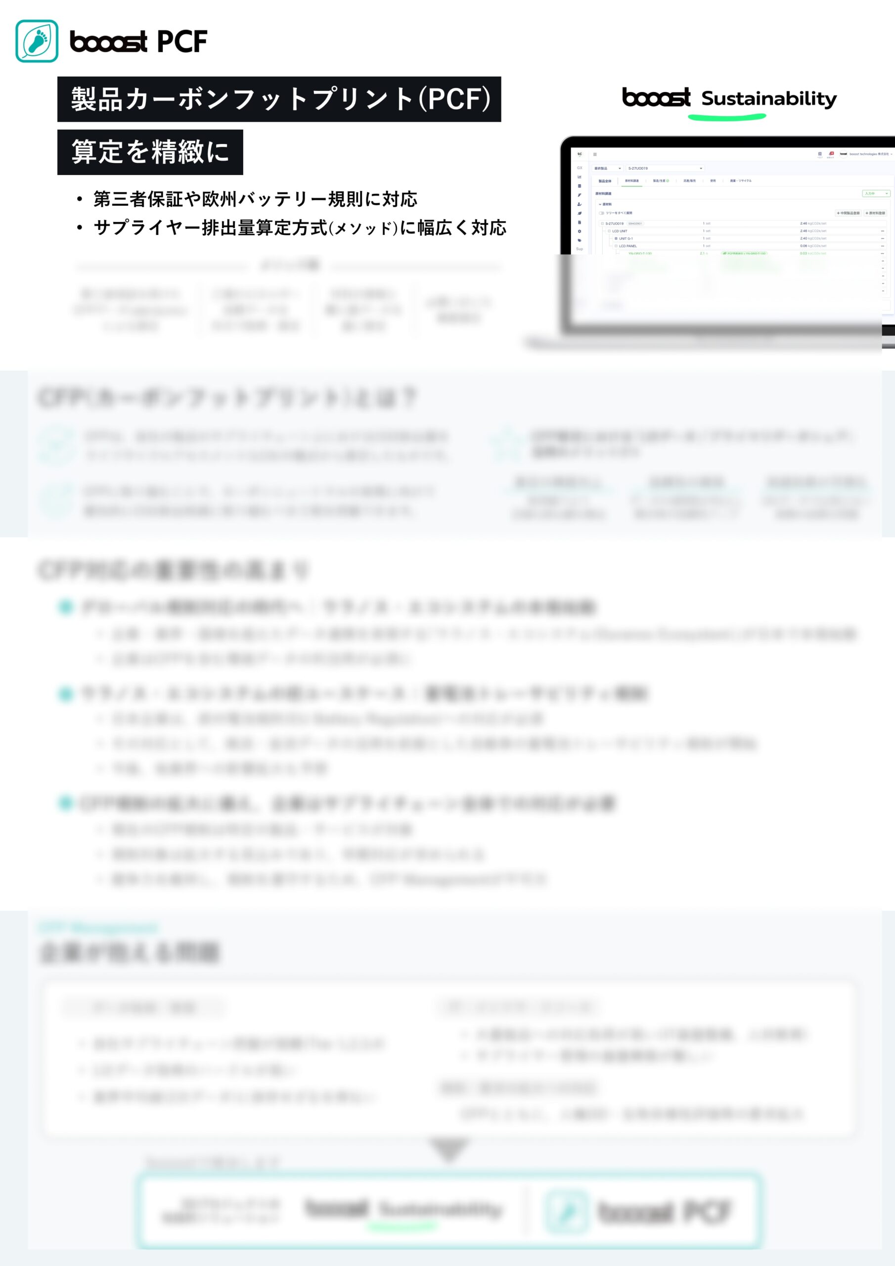 「booost PCF」は、製品カーボンフットプリント(CFP)を精緻に算定できるサービスです。